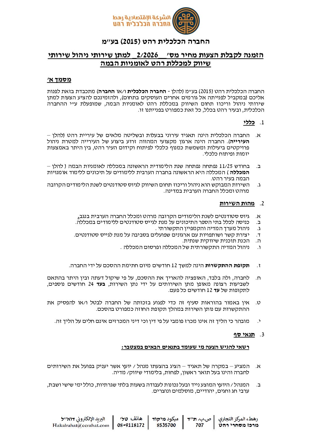 הזמנה לקבלת הצעות מחיר מס'__2/2026_ למתן שירותי ניהול שירותי שיווק למכללת רהט לאומניות הבמה