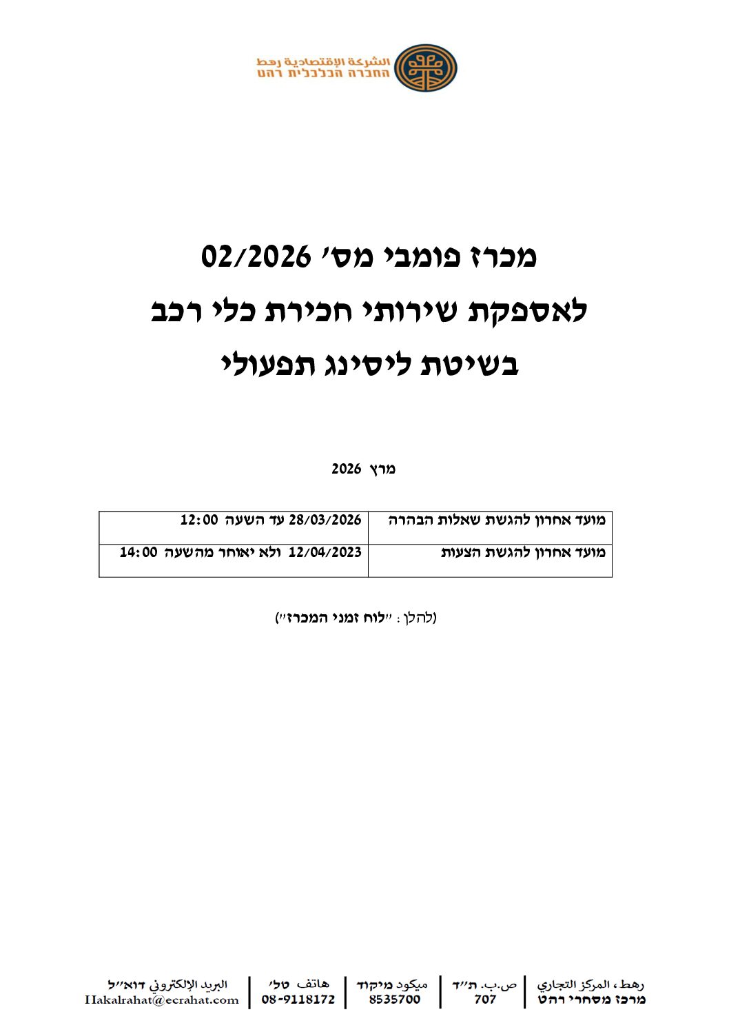 מכרז פומבי מס' 02/2026 לאספקת שירותי חכירת כלי רכב בשיטת ליסינג תפעולי