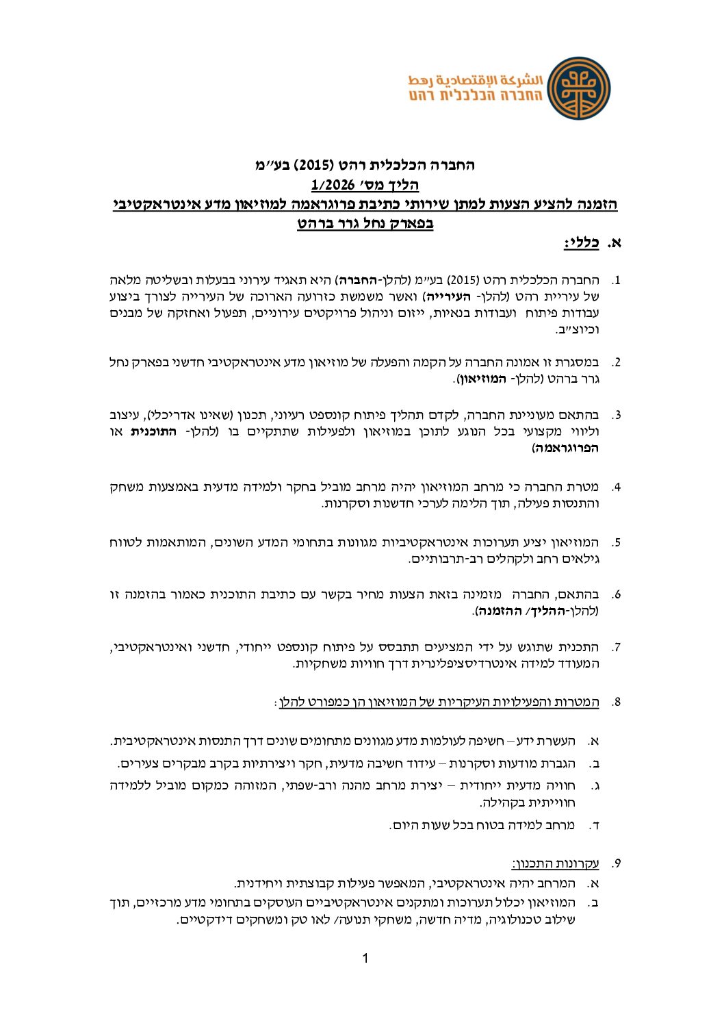 הליך מס' 1/2026 הזמנה להציע הצעות למתן שירותי כתיבת פרוגראמה למוזיאון מדע אינטראקטיבי בפארק נחל גרר ברהט